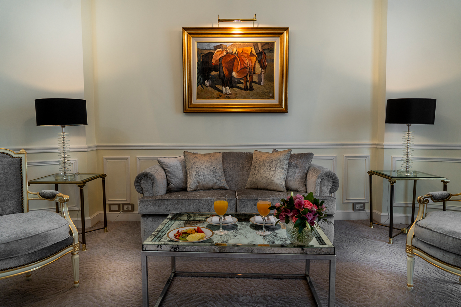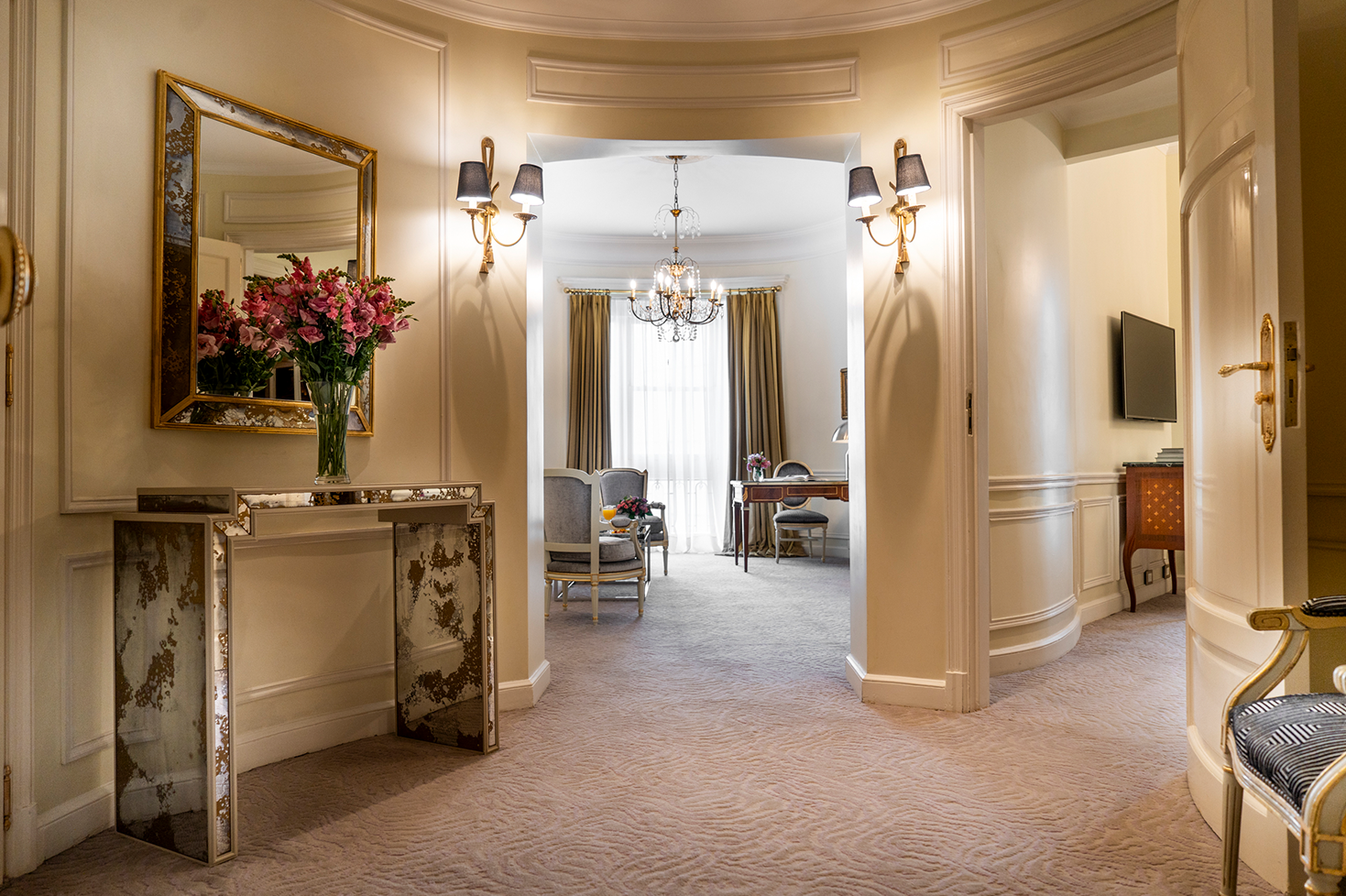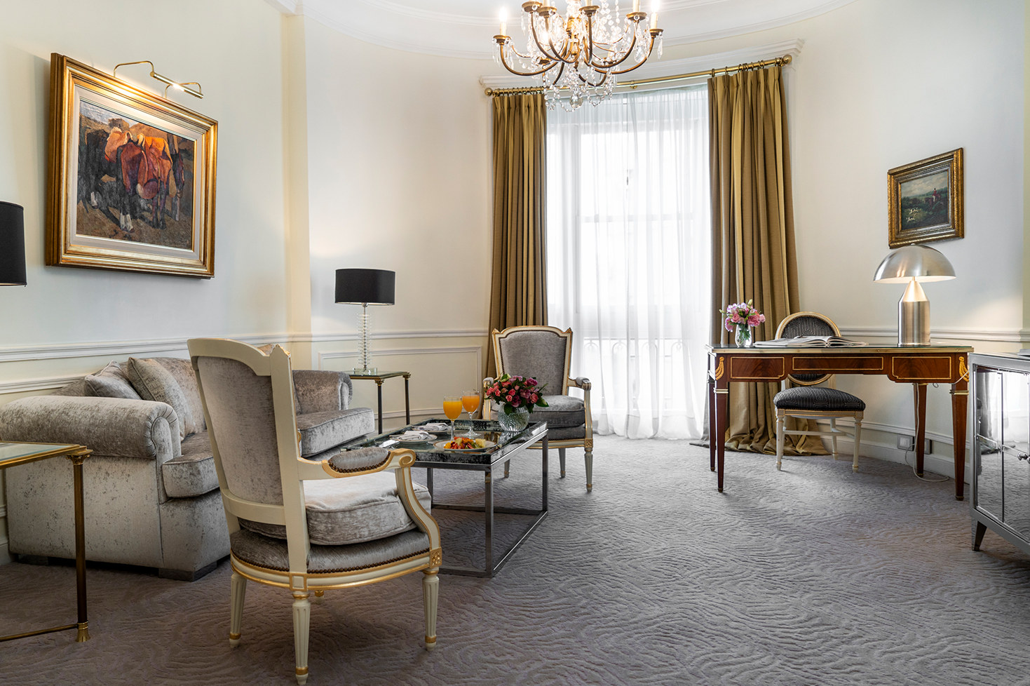 Spacious and bright, Governor suites are located in the attractive corners of the building with privileged views of the Recoleta neighborhood. In modern French style with a perfect blend between the classic spirit and new arrangements, be surprised by a fascinating feeling of pleasant elegance. The carefully selected French fabrics in golden colors, original design carpets, and chandeliers in bronze and glass recreate a serene space of luxury.