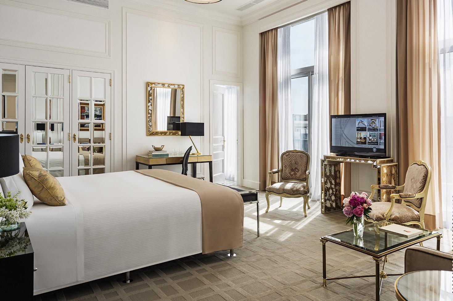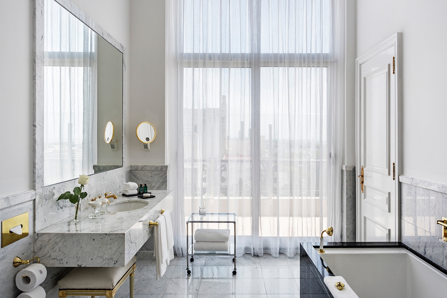 Located on the upper floors, the spacious and bright Junior Suites Le Mirador provide magnificent panoramic views of La Recoleta with its incredible parks and the silhouette of the Rio de la Plata through their large windows. With a modern classic style, the interior fuses contemporary design furniture with exquisite silks, velvets, and pure wool carpets, creating spaces of timeless charm. They have a French balcony or terrace balcony and luxurious bathrooms covered in Carrara marble and black Marquina, equipped with a bathtub, separate shower box, and bathroom amenities L´Occitane.