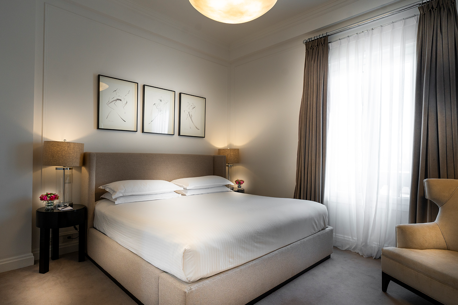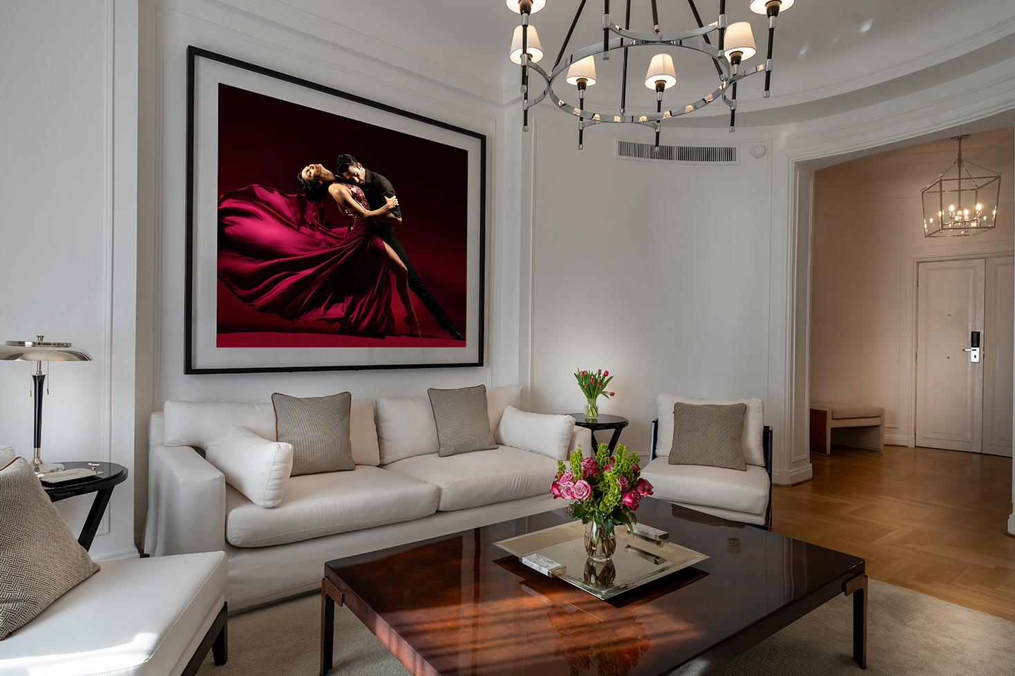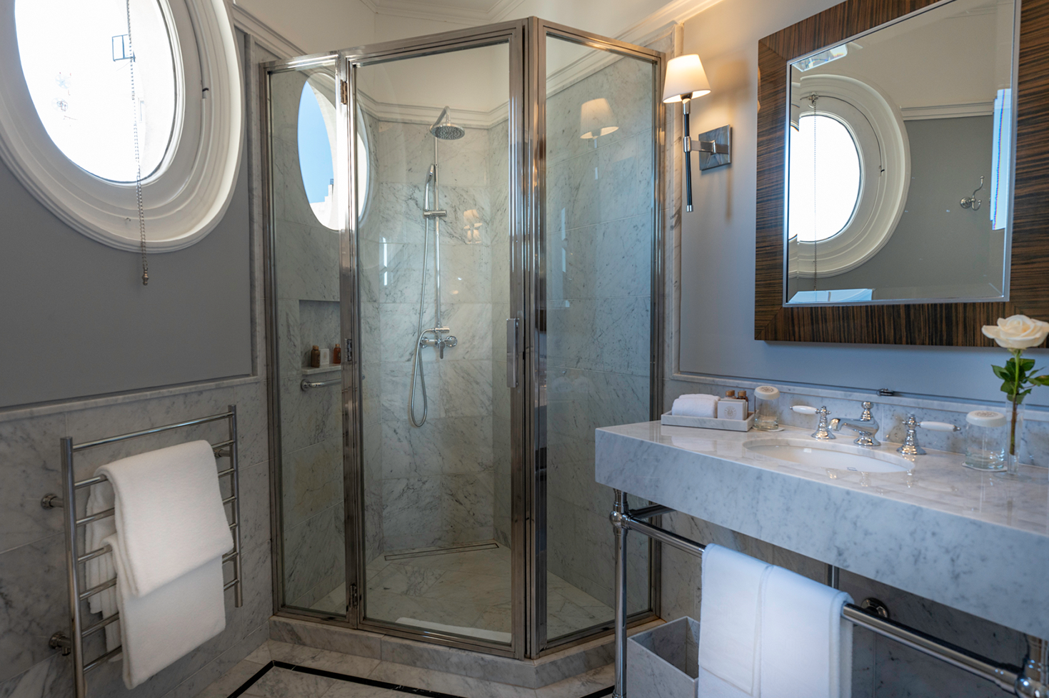 The suite comprises a welcoming reception area, a spacious oval-shaped living room with scenic views of the Recoleta parks, two bedrooms, and a generous dressing room. The bathrooms, clad with Carrara marble, are furnished with modern shower enclosures and bathroom amenities L´Occitane.