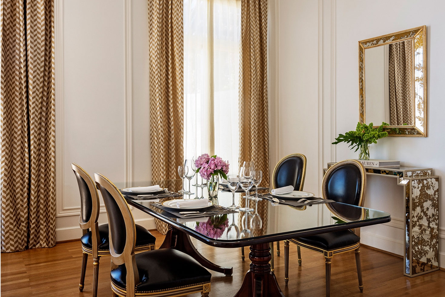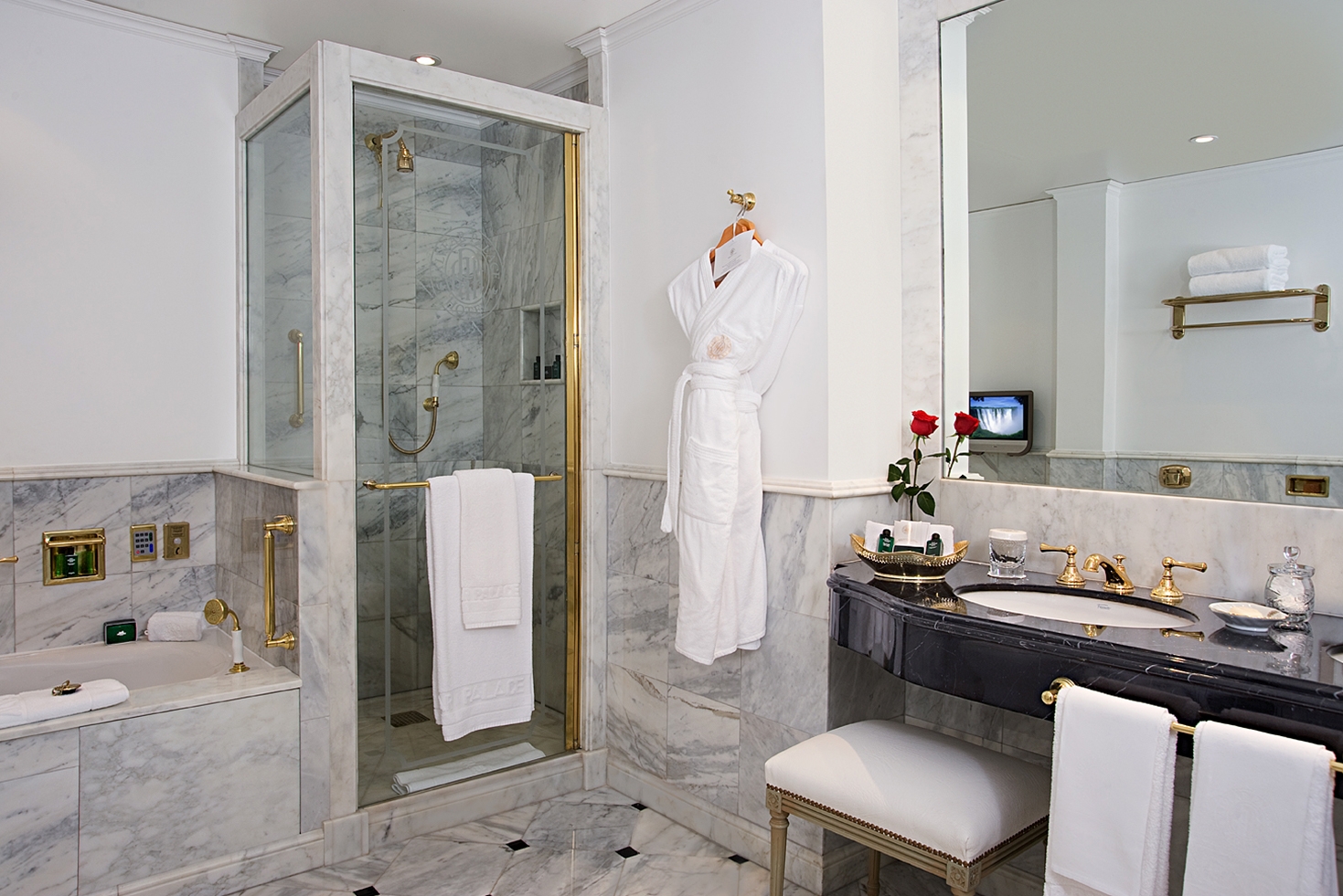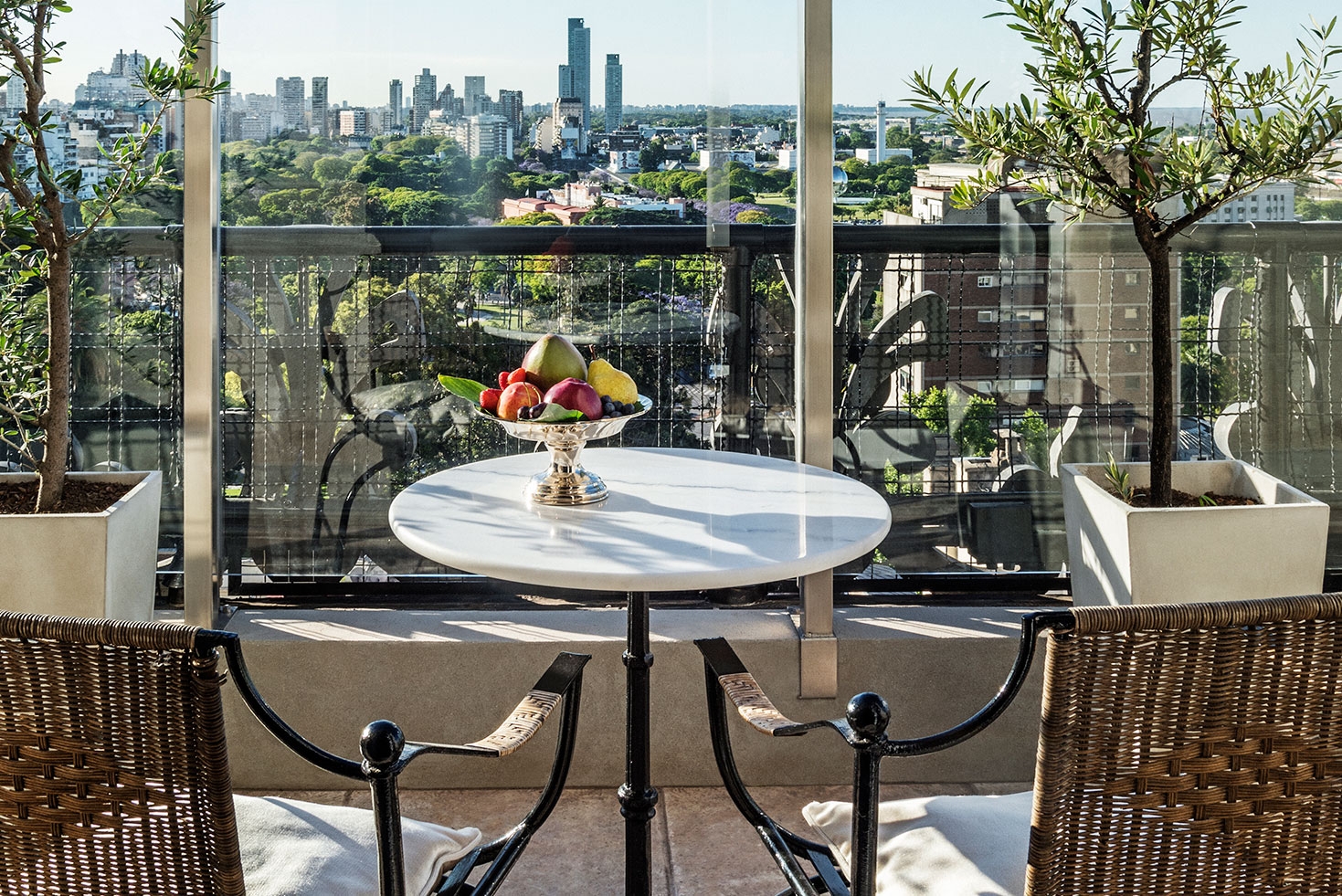 The uniquely designed Roof Garden Suite, with magnificent views of parks within Recoleta, features a comfortable bedroom, a spacious living room, a toilette, a terrace, and a balcony. The master bath, luxuriously clad in Carrara marble and black Marquina, includes a whirlpool, shower box, and bathroom amenities L´Occitane. The suite also has automatic curtains with wind sensors that afford total darkness.
