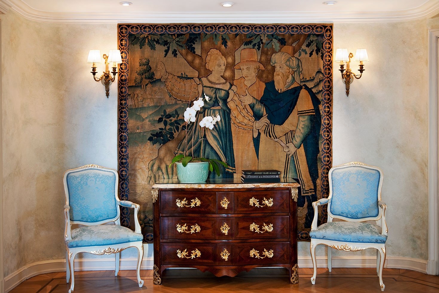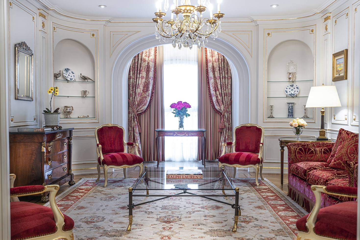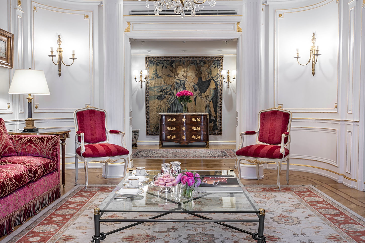 The curtains and upholstery in French fabrics, the glass and bronze chandeliers, the Slavonian oak floors, and Argentinian works of art highlight the different rooms of this impressive suite.