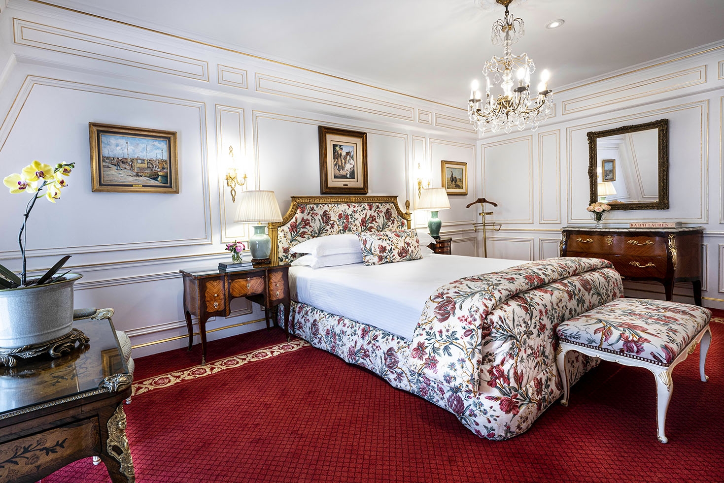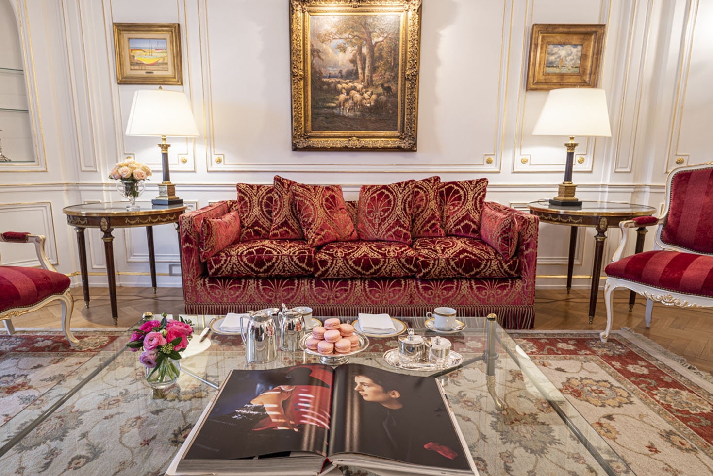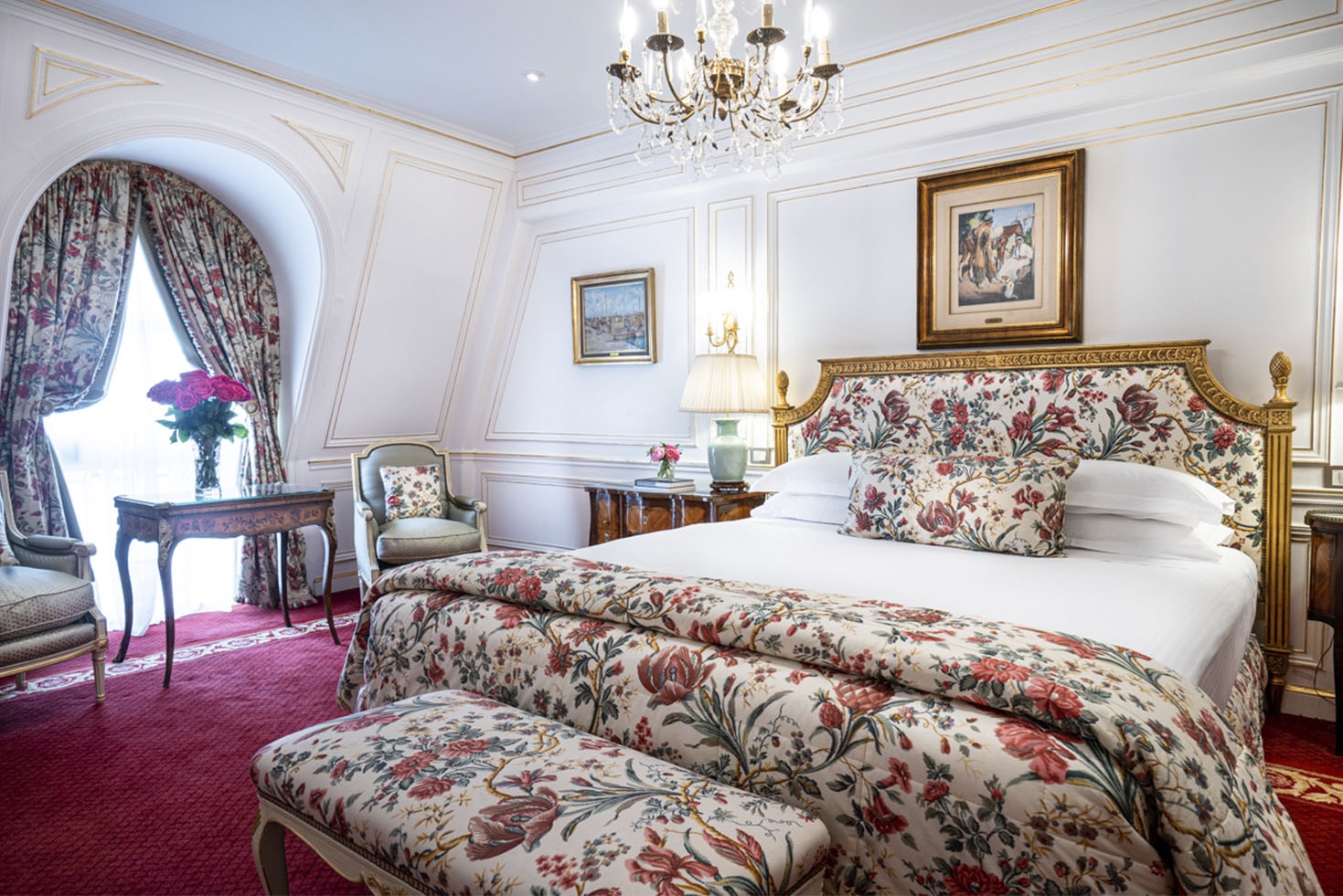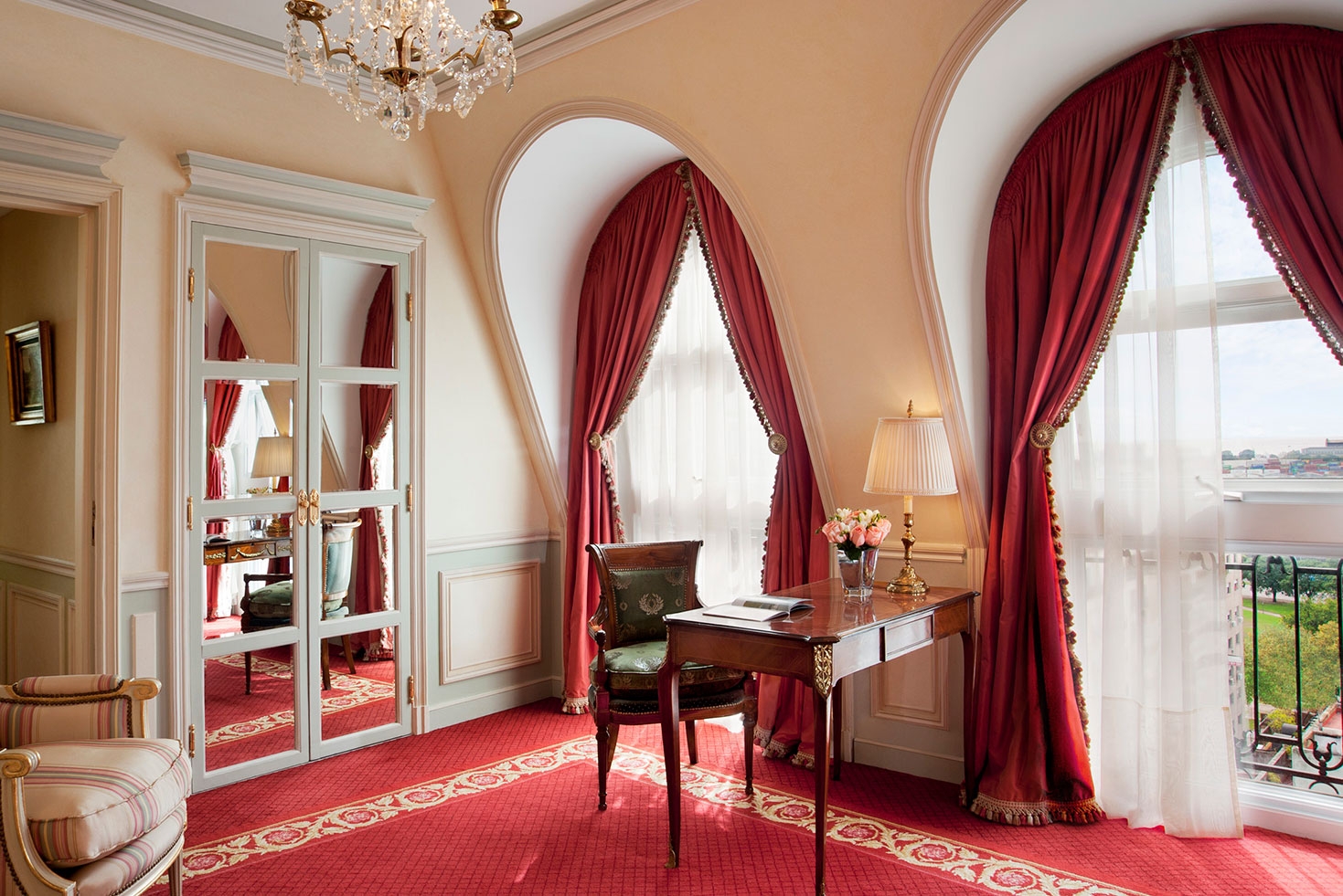 The curtains and upholstery in French fabrics, the glass and bronze chandeliers, the Slavonian oak floors, and Argentinian works of art highlight the different rooms of this impressive suite.